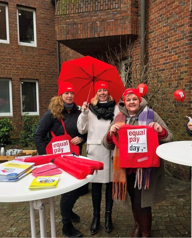 Bredstedt/Niebüll. Auch in diesem Jahr haben die Gleichstellungsbeauftragten im nördlichen Nordfriesland mit Andrea Dunker (Gemeinde Sylt), Christine Friedrichsen (Amt Mittleres Nordfriesland) sowie Sylke von Kamlah (Amt Südtondern) Präsenz am „Equal Pay Day!“ (27.02.) gezeigt. Gemeinsam mit dem Kreisverband des SOVD, vertreten durch Johanna Voigts und Renate Schramm, haben sie diesmal in Niebüll auf die Lohnlücke („Gender Pay Gap“) zwischen Frauen und Männern aufmerksam gemacht. „Traurig, aber wahr: Für gleiche Arbeit erhalten Frauen in Deutschland im Schnitt 16 Prozent weniger Lohn als Männer“, erläuterte Christine Friedrichsen.