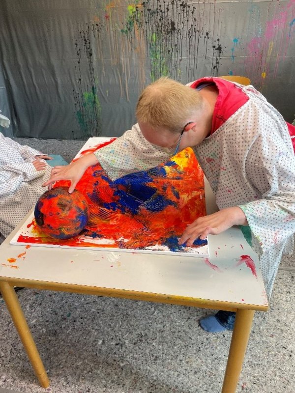 „Wir haben die Tagesstätte für das Projekt in ein farbenfrohes Atelier verwandelt“, berichtete Britta Hansen aus der Mitarbeiterschaft. Sie und weitere Teammitglieder hatten die Kunstaktionswoche bestens vorbereitet: Pinsel, Rollen, Spritzpistolen, Leinwände und eine große Auswahl an Farben waren bereitgestellt. Hansen ergänzte: „Die Wände und den Fußboden hatten wir mit Folie ausgelegt, sodass unsere Künstlerinnen und Künstler sich völlig frei austoben konnten.“ So ist in jedem einzelnen Bild eine ganz besondere Energie zu spüren, die sich auf die Betrachtenden überträgt.